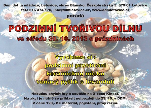 Vyrobíme si: podzimní prostírání, keramickou misku, voňavý pytlík s levandulí.Nebudou chybět hry a soutěže se Zdenkou a Barčou a hry na X boxu Kinect. Na akci je nutné se přihlásit nejpozději do 23.10.2013 v DDM . V ceně 120,- Kč materiál, pojištění, pitný režim. Plakátek ZDE