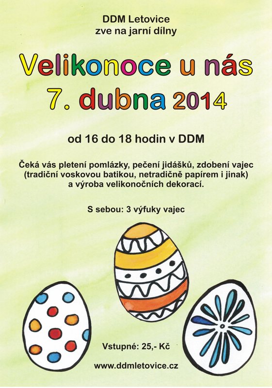 V pondělí 7. dubna 2014 od 16 do 18 hodin v DDM Letovice. Čeká vás pletení pomlázky, pečení jidášků, zdobení vajec (tradiční voskovou batikou i netradičně papírem) a výroba velikonočních dekorací.