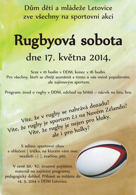 Rugby se hodí nejenom pro kluky, ale pro holky. Od příštího školního roku plánujeme otevřít kroužek rugby, tak si přijďte vyzkoušet, jestli by vás to bavilo a nahlaste se do 14. 5. 2014 v DDM!