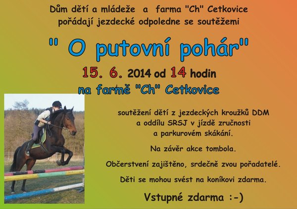 Dům dětí a mládeže a farma CH Cetkovice pořádají jezdecké odpoledne se soutěžemi „O putovní pohár“. Termín neděle 15.6.2014 od 14 hodin na farmě „CH“ Cetkovice. Děti z jezdeckých kroužků DDM a SRSJ budou soutěžit v jízdě zručnosti a parkurovém skákání. Na závěr tombola. Občerstvení zajištěno. Děti se mohou zdarma svézt na koníkovi.