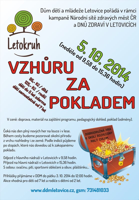 Dům dětí a mládeže Letovice pořádá v rámci kampaně Národní sítě zdravých měst ČR a Dnů zdraví v Letovicích dobrodružnou akci "Vzhůru za pokladem", která se uskuteční 5. října 2014 v neděli od 9,58 do 15,36 hodin. V ceně 95,- Kč / dítě (doprava, materiál na zajištění programu, pedagogický dohled, poklad) a 125,- Kč / rodič.
