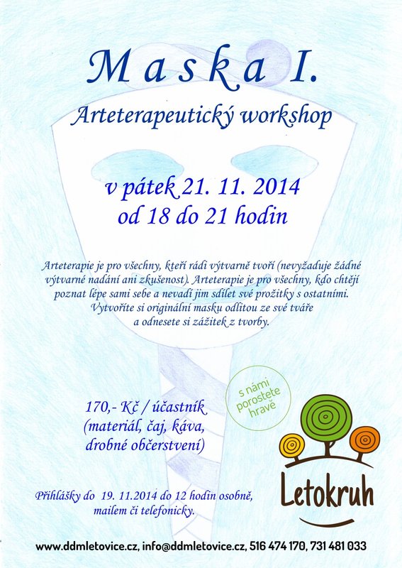 Arteterapie je pro všechny, kteří rádi výtvarně tvoří (nevyžaduje žádné výtvarné nadání ani zkušenost). Arteterapie je pro všechny, kdo chtějí poznat lépe poznat lépe sami sebe a nevadí jim sdílet své prožitky s ostatními. Již vytvořený odlitek si dotvoříte do podoby originální masky. Pokusíme se odhalit symboliku masky a to, jak souvisí s naší osobností.
