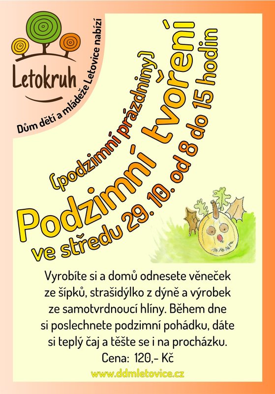 PODZIMNÍ TVOŘENÍ od 8,00 do 15,00 si můžete v DDM vytvořit věneček ze šípků, strašidýlko z dýně a výrobek ze samotvrdnoucí hlíny. Kromě tvoření si poslechnete podzimní pohádku a po procházce si vypijete teplý čaj. Cena je 120,- Kč