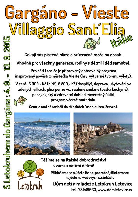 Vyrazte s námi na Gargáno do Itálie! Druhý zářijový týden 2015. Pobyt je určen pro děti i dospělé, rodiče, prarodiče, zkrátka s námi může jet každý.