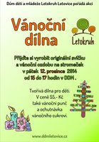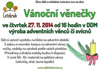 Výroba adventních věnců. Vytvoříte si dekoraci pro blížící se adventní období. S sebou si vezměte: korpus na adventní věnec, svíčky, ozdoby na výrobek podle vašich představ. Přírodniny a drobné ozdoby budou k dispozici i v DDM. V ceně 50,- Kč: materiál na oplétání věnce (větvičky, drát, tavné lepidlo) a vánoční čaj. Na dílnu je nutné se nahlásit předem.