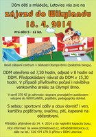 Zájezd do Wikylandu v Brně 18. 4. 2014 vhodný pro děti od 5 do 12 let. Wikyland je nové zábavní centrum v blízkosti Olympie v Brně (obdoba BONGA). DDM bude otevřeno v den zájezdu od 7,30 hodin. Plánovaný odjezd v 8 hodin od DDM. Předpokládaný návrat do DDM v 15,30 hodin. V případě příznivého počasí i návštěva venkovního areálu za Olympií Brno. V ceně 370 Kč je zahrnuto: doprava pronajatým autobusem, vstupné do Wikylandu, pojištění, pedagogický dohled. S sebou: sportovní oděv a obuv dovnitř i ven, kartičku pojišťovny, svačinu, pití, kapesné na občerstvení Přihlášky přijímáme do 14. 4. 2014 a do naplnění kapacity autobusu.