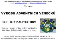 Zveme vás dne 29. listopadu od 15,30 do DDM na tradiční výrobu adventních věnečků. Přijďte se vánočně naladit a vyrobit si originální věneček na váš sváteční stůl.