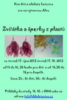 Zveme vás na výtvarnou dílnu "Zvířátka a šperky z plastu". Dílnička se koná ve čtvrtek 17. 10. 2013 v DDM, od 15 do 16, 30 pro děti a od 16,30 do 17 hodin pro dospělé. Nutné je přihlásit se předem, pokud můžete, přineste si různobarevné plastové láhve. Těšíme se na tvůrčí odpoledne!